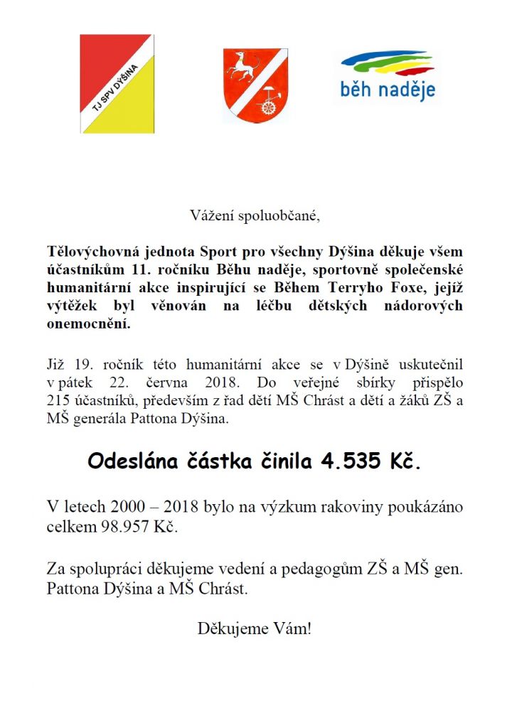 Tělovýchovná jednota Sport pro všechny Dýšina z.s. děkuje všem, kteří se zúčastnili tradičního již 11. ročníku Běhu naděje, který se v Dýšině konal 22. 6. 2018. Výtěžek akce byl věnován na léčbu dětských nádorových onemocnění. Více informací zde:
